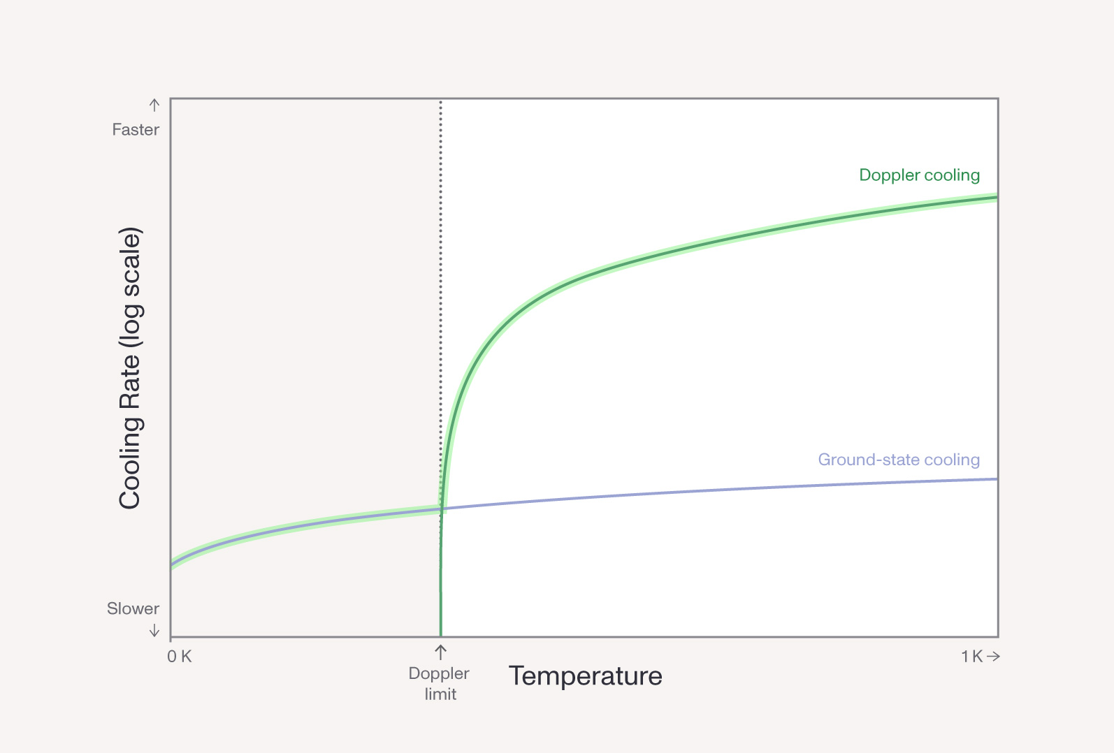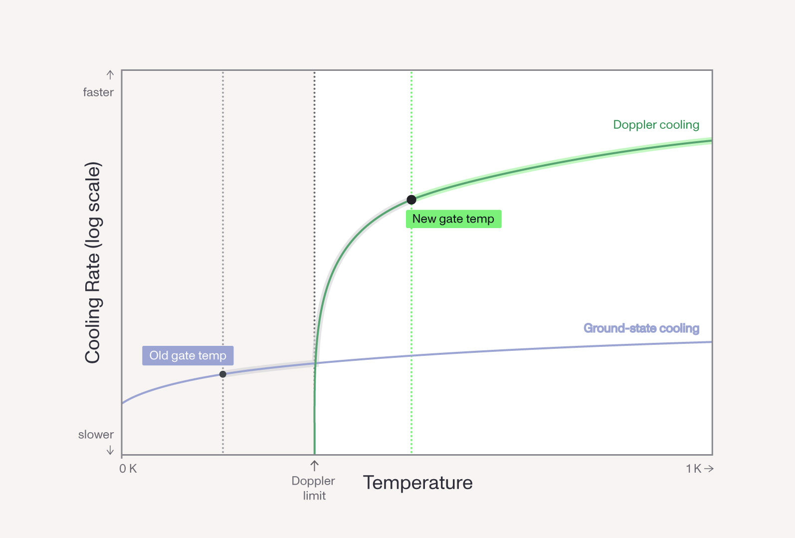 Laser cooling efficiently cools hot ions (through so-called “Doppler cooling”) down until it hits a wall at a few hundred uK – the so-called ‘Doppler limit’. However, beyond this limit, a different cooling technique is required for the last fraction of a millikelvin: “ground-state cooling”. And unfortunately, the methods available for this ‘second-stage cooling’ tend to be many orders of magnitude slower. Thus, a ‘cooling speed’ vs. ‘temperature graph’ may end up looking something like this: